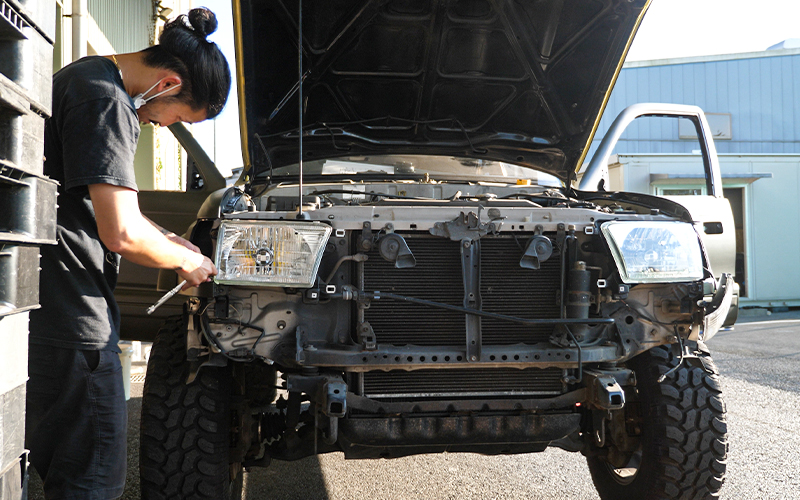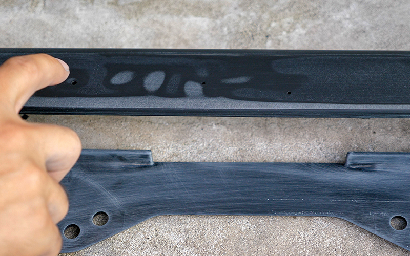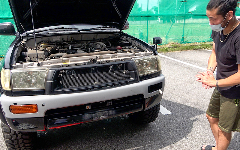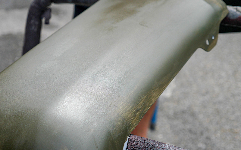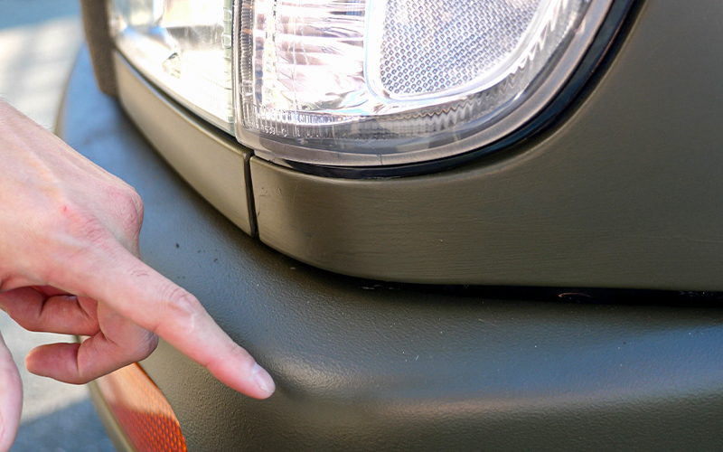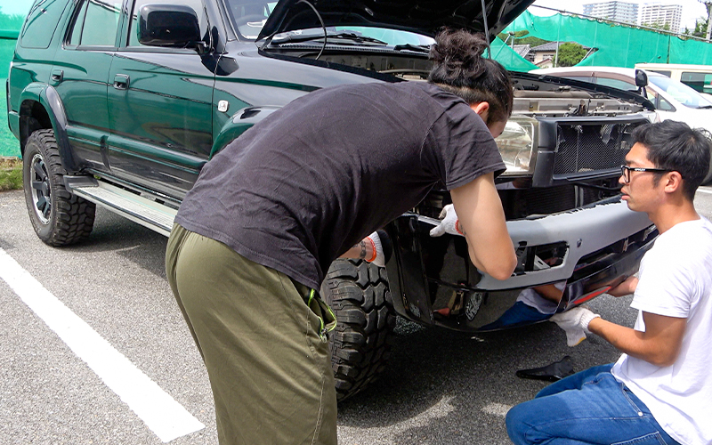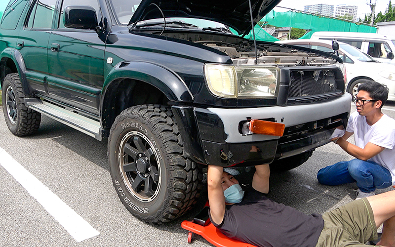 それで、始めに岩ちゃんが「フロントバンパーは高圧洗浄機で剥がれちゃった」っていう話をしていたんですが、今見てみると全部綺麗に剥がれていなかったので段差ができている箇所がいくつかありました。