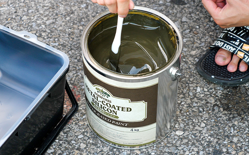 今回は、岩ちゃんが事前に用意してくれていた、タカラ塗料の『タカラ塗料オリジナル 水性オリーブドラブ(4kg)』を使って塗装していきます。
