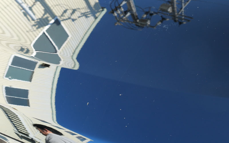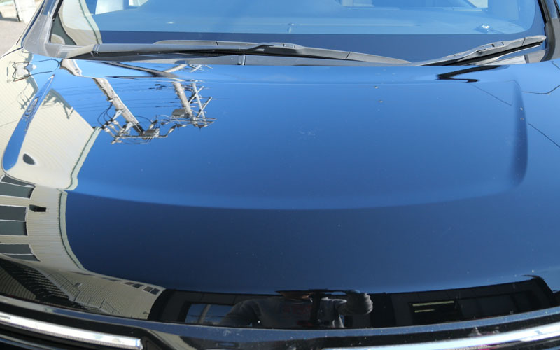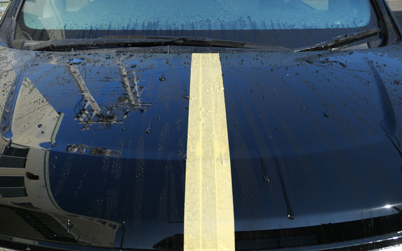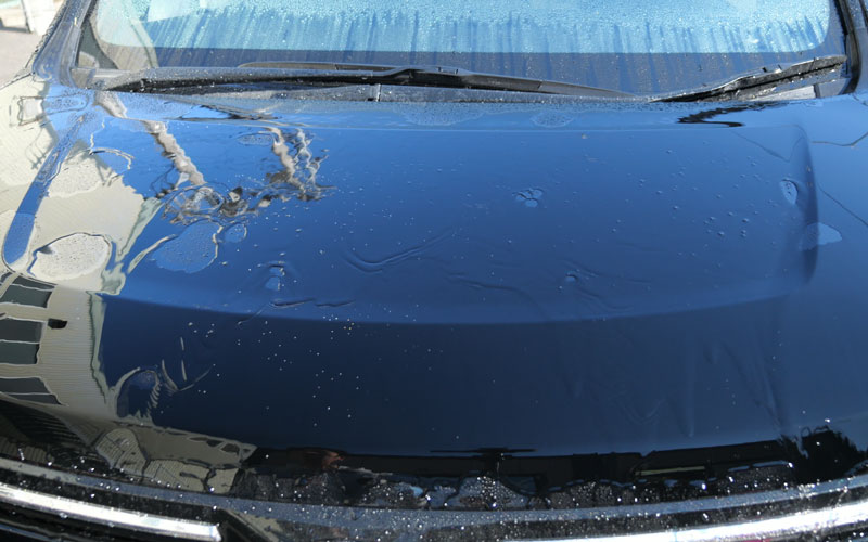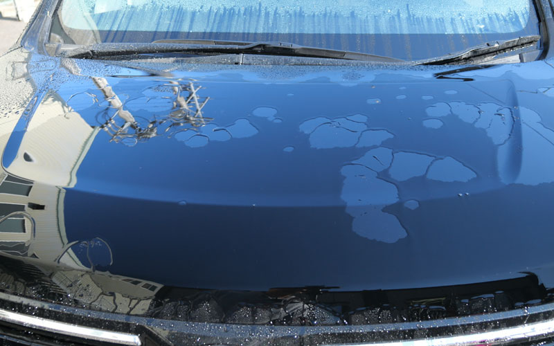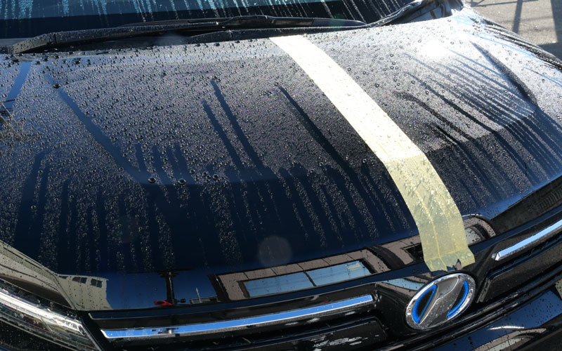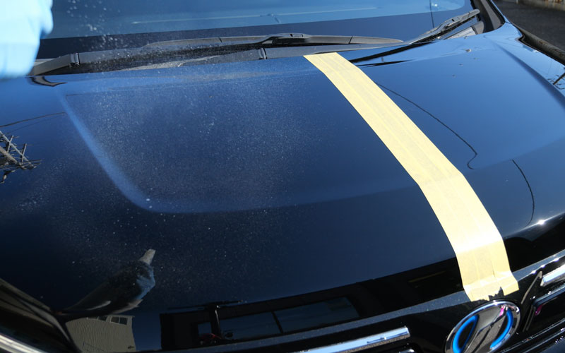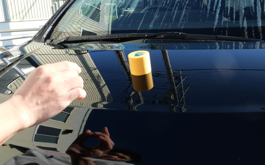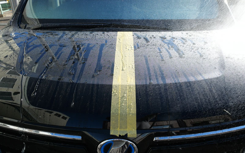 左右とも「No.12」が施工されていて、施工後24時間が経過したので、右(助手席側)に「No.13」を施工していきたいのですが、砂埃がボンネットに乗っているので、水をかけて砂埃を落とします。