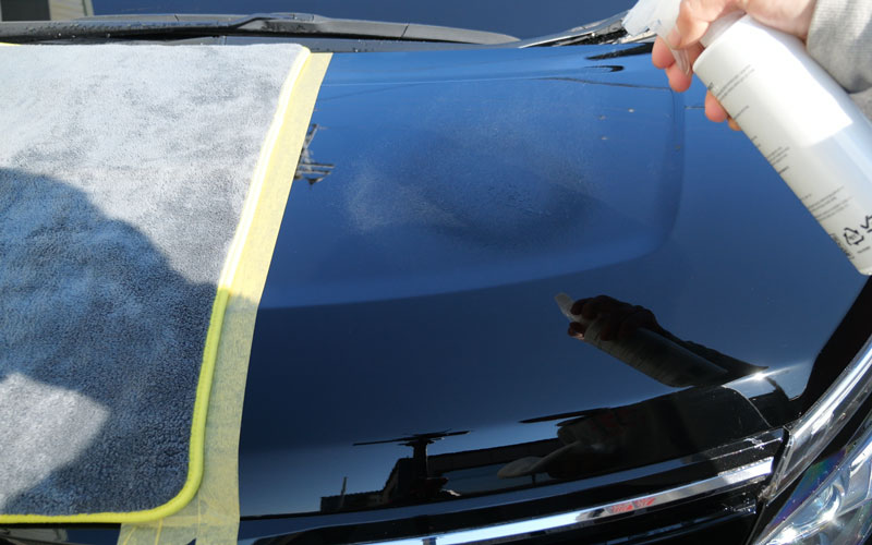 ① 洗車後、水滴が残っている状態で、ボディに直接適量を吹きかけ、固く絞ったタオルで水拭きし伸ばした後、乾いたきれいなタオルで拭き上げてください。若しくは、濡らして硬く絞ったタオルにスプレーを適量馴染ませてから、ボディに塗り広げて、間をおかずに乾いたきれいなタオルで拭き上げてください。