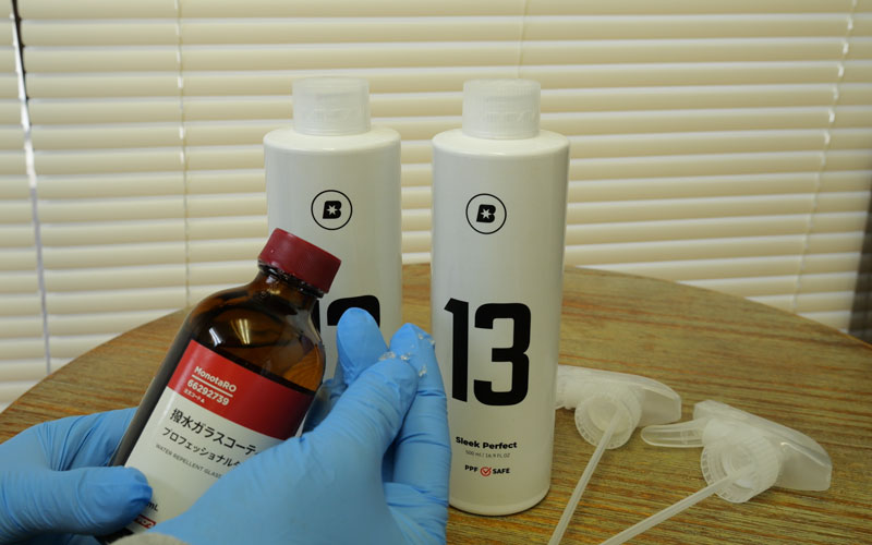 今回使用する商品は「No.12」と「No.13」です。両方ともコーティング剤になります。ブラスクは全商品に番号が振ってあって、現在は 1~13 までの13商品が展開されています。※プロ向けを除く