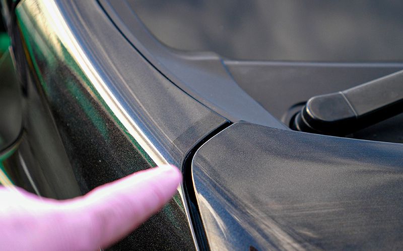 ボンネットではないところにも少しクロスが触れてしまったのですが、触れただけでこんな感じ。艶というか色が変わり、黒さが増していると言えば増している状態になりました。触れただけでこれって…。