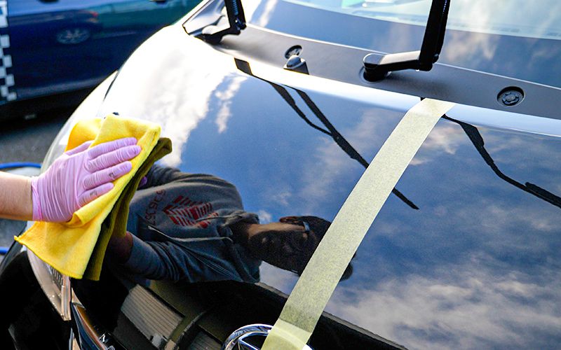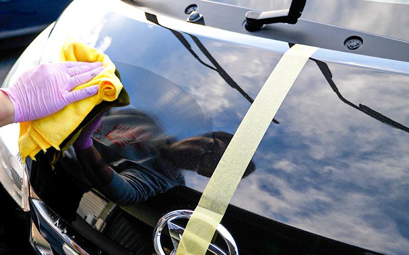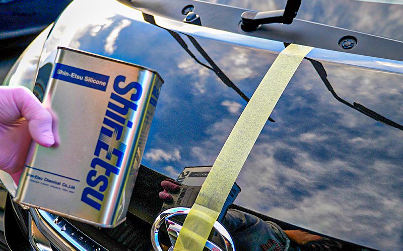 まずはボンネット。中央をマスキングテープで仕切り、右側に『キラサクGP』、左側に『信越シリコーン』を施工していきたいと思います。