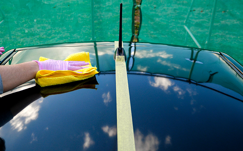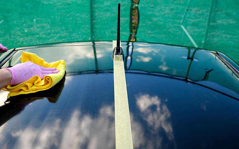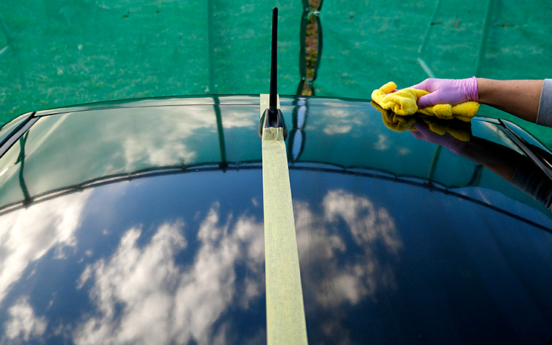 ルーフ全体のシリコンオイルを均していきます。先ほどと違い下地処理をしていない場所の場合、水あかにクロスが引っかかるのかスジが残る場所が多く、ボンネットほど簡単に均すことができません。