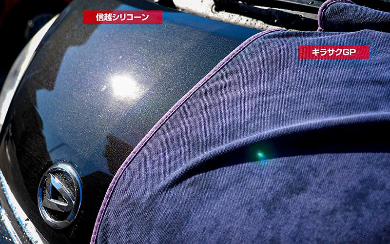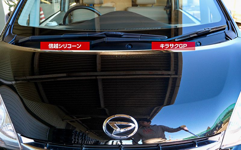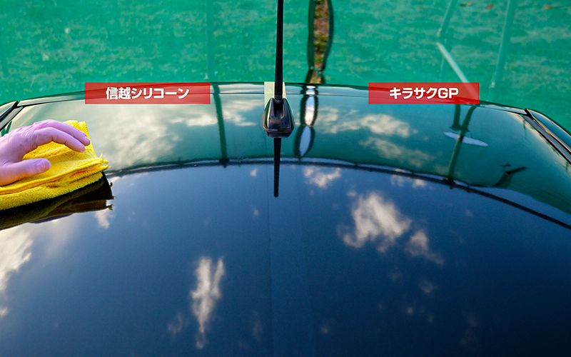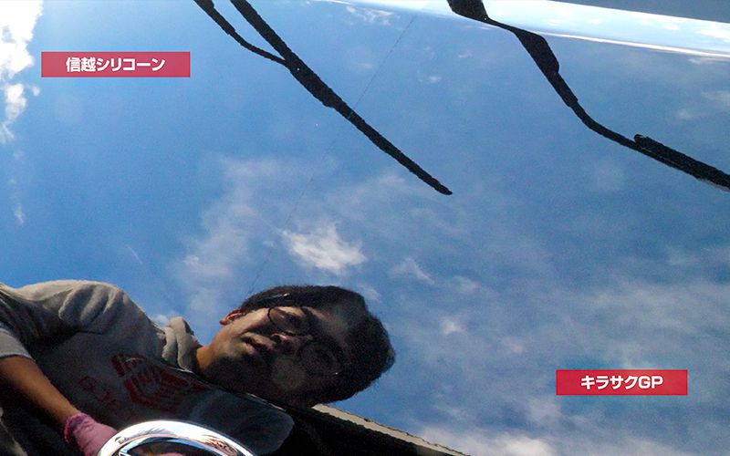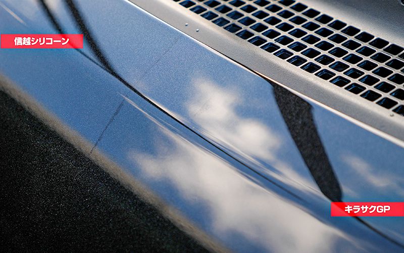 こちらもボンネット同様、中央をマスキングテープで仕切りました。右側に『キラサクGP』、左側に『信越シリコーン』を施工してみます。