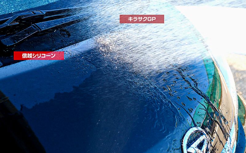 撥水力はこんな感じ。『キラサクGP』は相変わらずの強撥水で水がまとまりになりません。