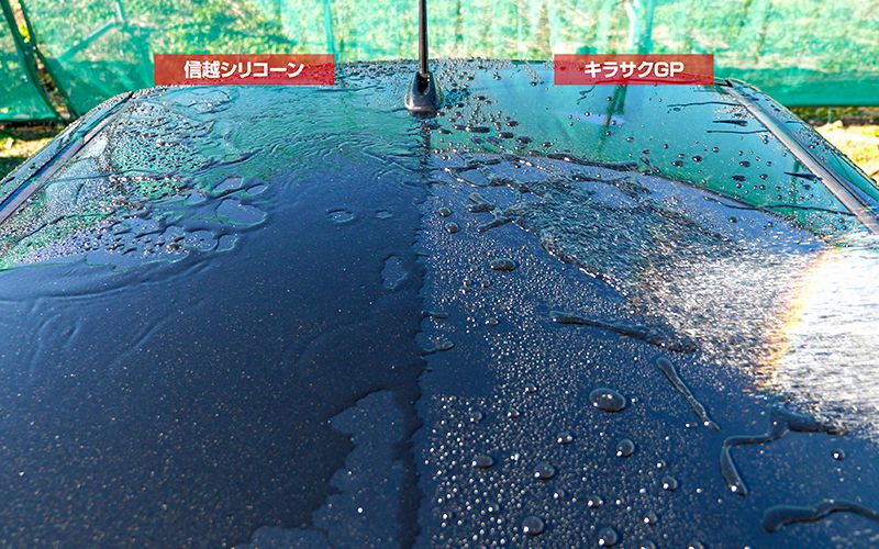 水が球状になる『キラサクGP』と、水が膜になる『信越シリコーン KF96』。撥水効果の違いは一目瞭然です。
