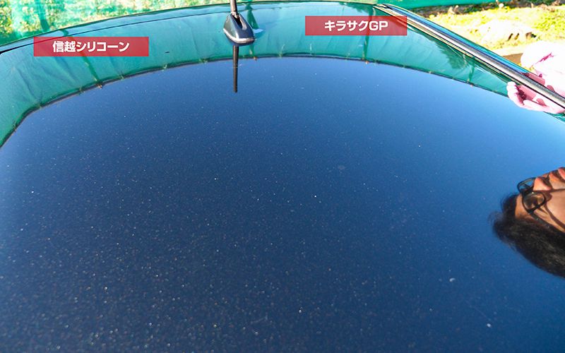 こちらがルーフの様子。右側が『キラサクGP』、左側が『信越シリコーン』です。やはり両方ともきちんと艶が出ていますが、若干『信越シリコーン』の方が濃い気がします。