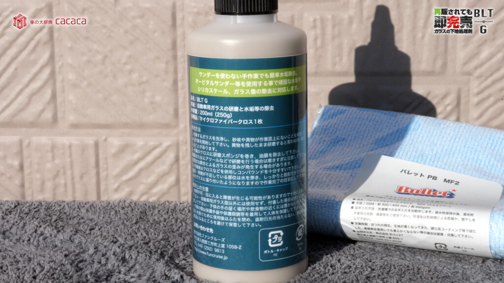 今回はこちら “Billet(バレット)” の『BLT-G』というガラスの油膜除去剤を使ってみようと思います。