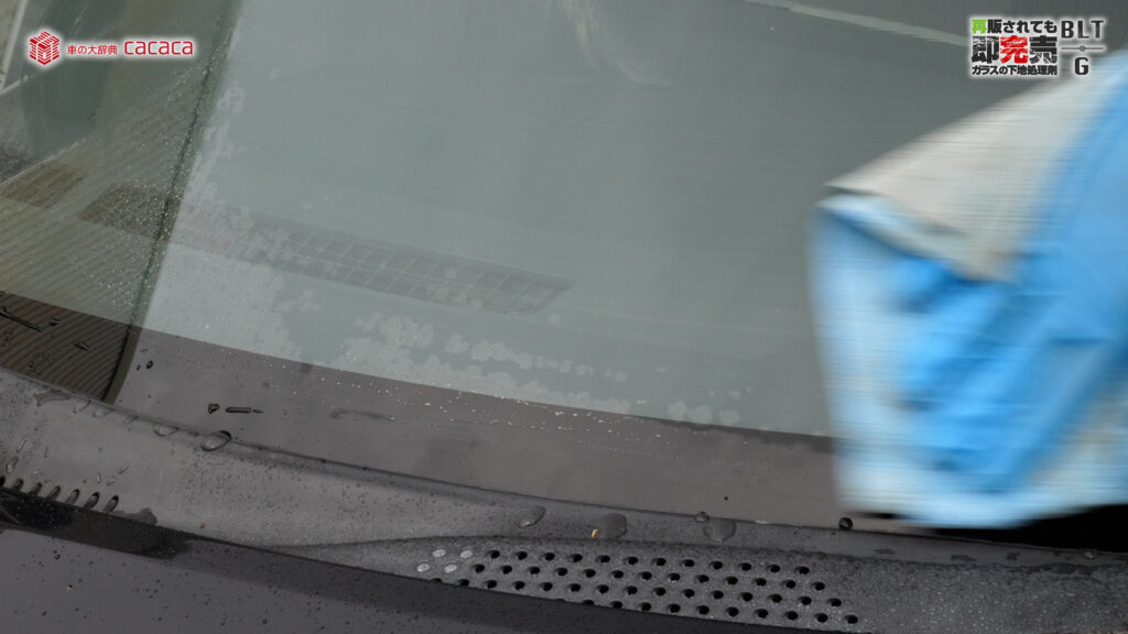 具体的には、モンスターリセット、僕が「人参」と呼んでいるものと比べると、モンスターリセットの方が水アカの除去率が良く、素早く落とせます。しかし、油膜や古い撥水剤に関してはBLT-Gの方が圧倒的に速いです。