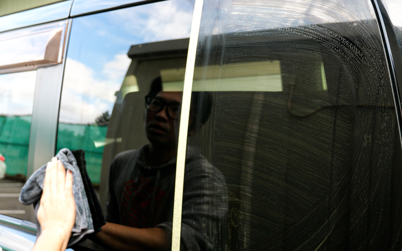 ①ガラスの油膜を綺麗に取り除いて乾いたタオルで拭き上げてください ②『オタマジャクソン』の溶剤がブラシに浸透するまでボトルを軽く押してください。ガラスへ均等に塗布してください ③撥水皮膜を形成するまで5分程度乾燥させてください ④絞ったマイクロベロア等で綺麗に拭いてください