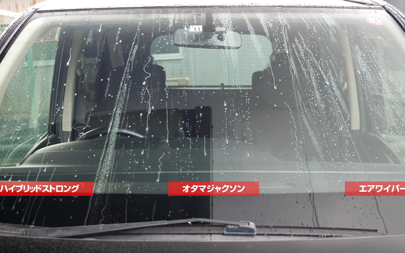 水をかけてみた感じだと、左に施工した『ハイブリッドストロング』が1番水残りが少ないような感じがします。逆に1番水残りが多いのは右側に施工した『エアワイパー』のような感じがしました。