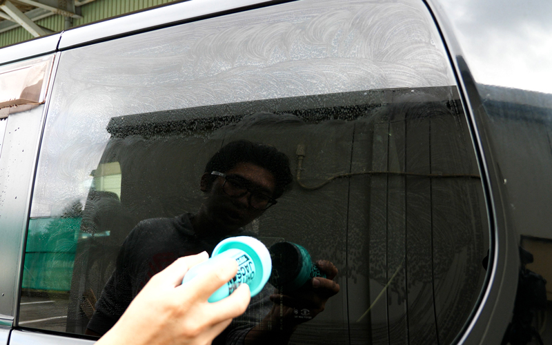 『エアワイパー』の使用方法は、A剤をスポンジに染み込ませて塗って5~10分放置し拭き上げた後に、さっきとは別のスポンジにB剤を染み込ませて塗って5~10分放置し拭き上げて施工終了です。