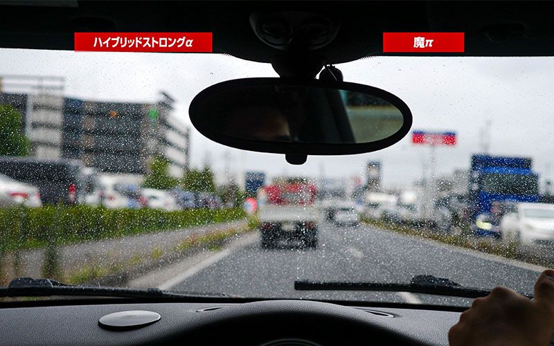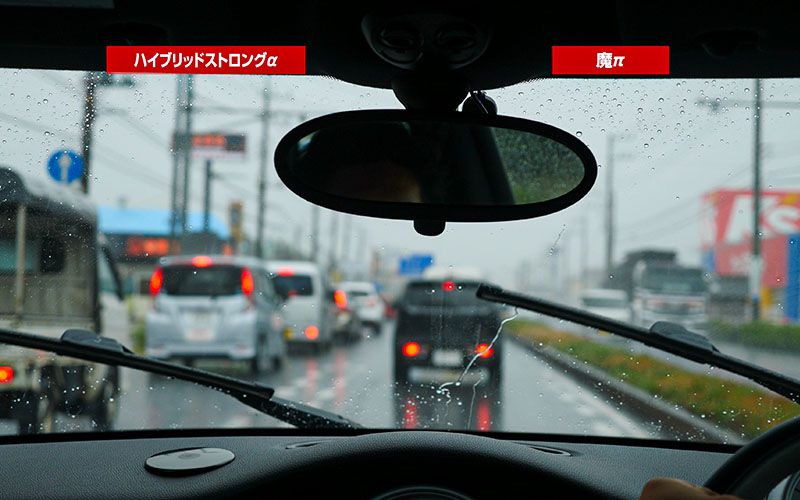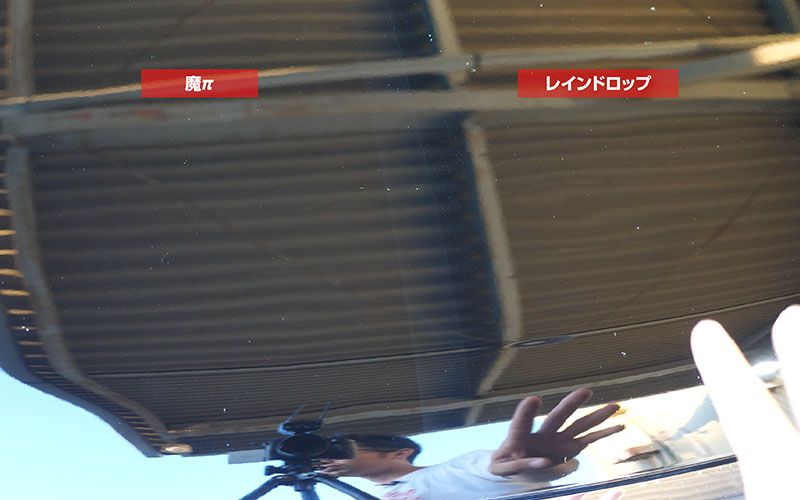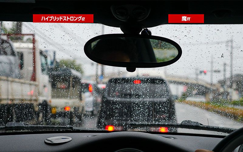 停車時に大きな差はありませんね。『魔π』の方が付着している水滴の量がちょっと多いくらい。ワイパーを使ってみます。