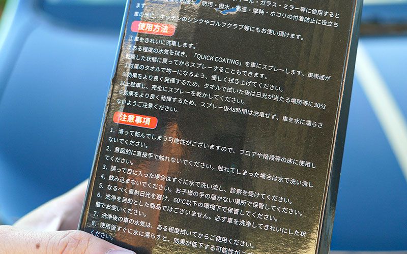 ※効果をより良く発揮するため、タオルで拭いた後は日光が当たる場所などに30分以上駐車し、完全にスプレーを乾かしてください。