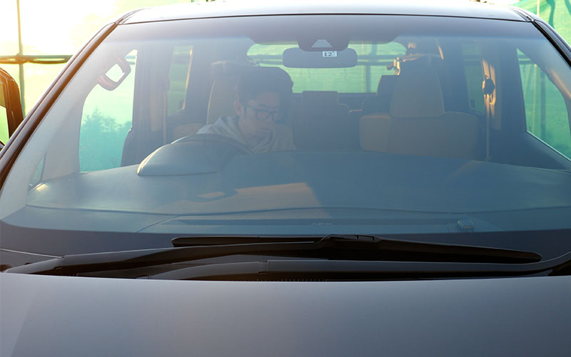 普通の車よりフロントガラスが大きいので、無理に内窓の下部分を拭こうとすると…