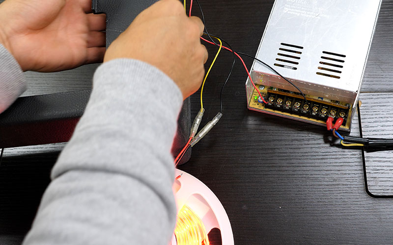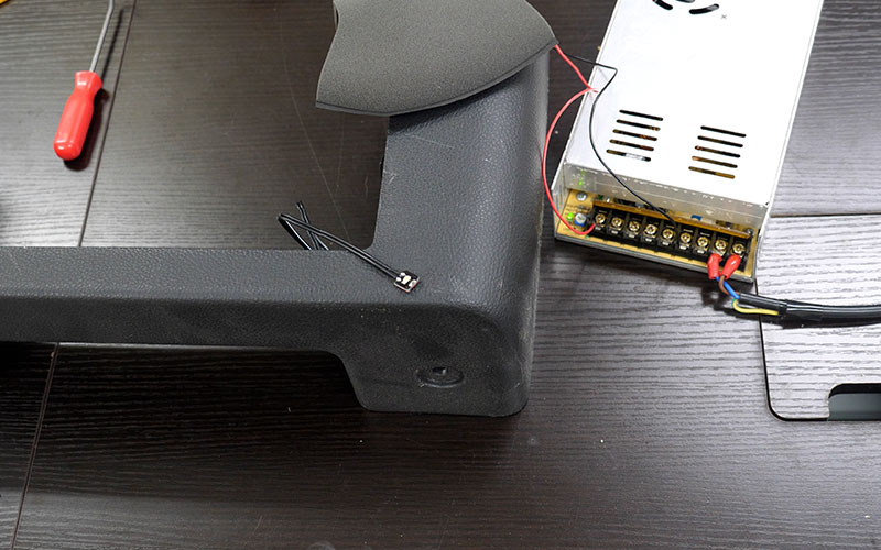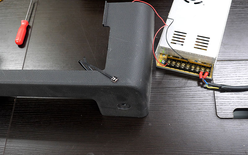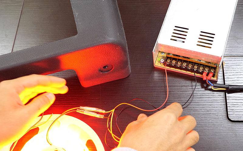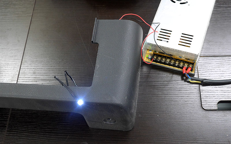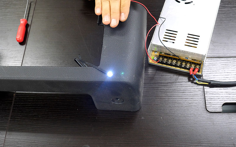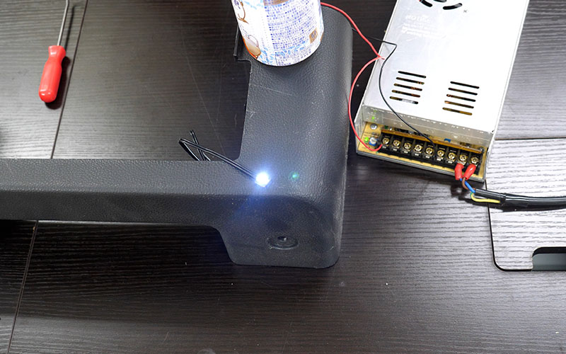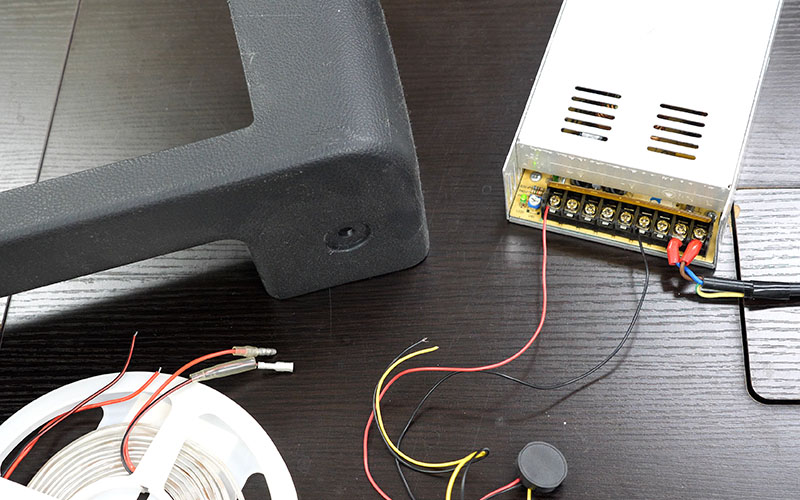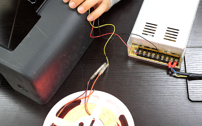 ステルススイッチをコンバーターとLEDテープに接続し、樹脂パーツの裏側に隠したら、樹脂パーツの上に手をかざすだけでLEDが点くようになります!
