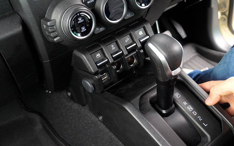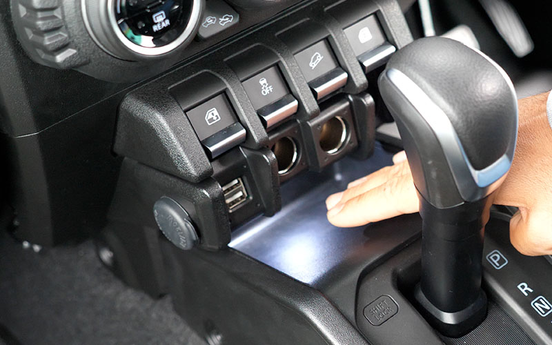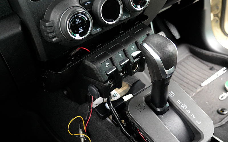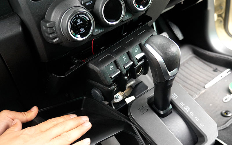 実際にステルススイッチをジムニーシエラに取り付けてみようと思います。現状色々とバラバラになっていますが、シフトノブの下にトレイがあります。