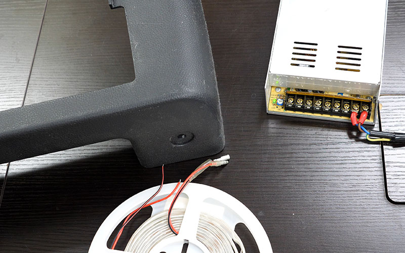 テスト用のコンバーターと赤く光るLEDテープと樹脂パーツを用意しました。