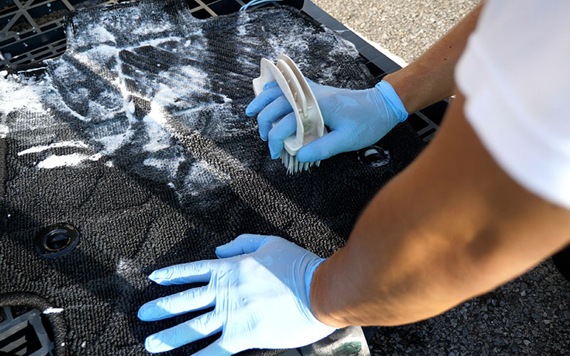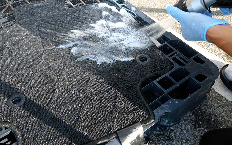 フロアマットは叩くのが1番いいんですが、今回は洗剤を使って洗っていきます。だけど乾かすのが大変なので、そのあたりは頭に入れておいてもらいたい。