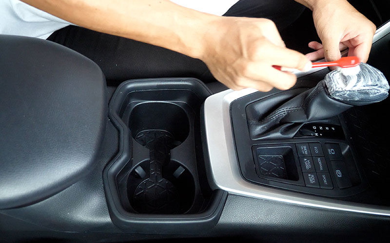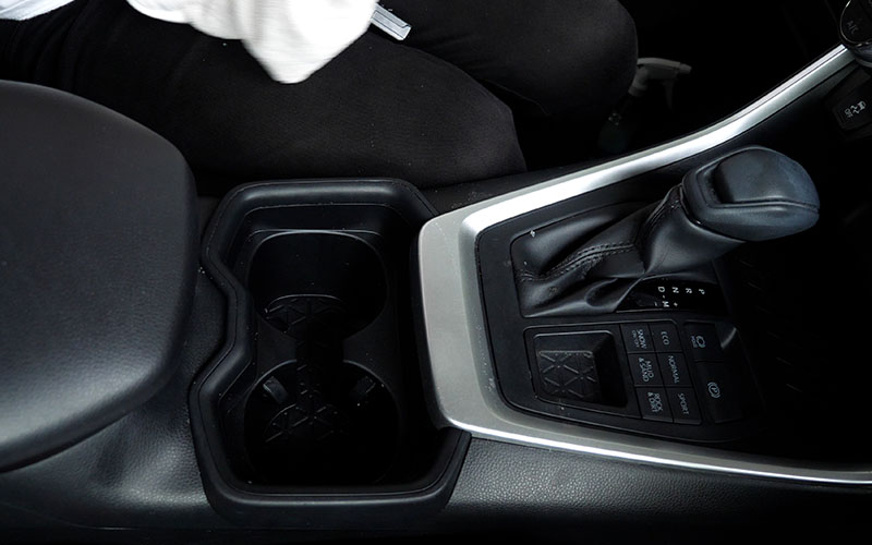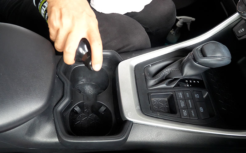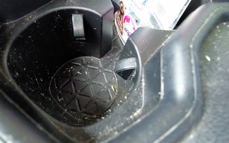 それで細かいところを見ていくと、ダッシュボードの辺りとかトレーとかも汚れています。シフトノブも汚れていて、ドリンクホルダーも結構汚れているので、掃除していきたいなといった感じです。