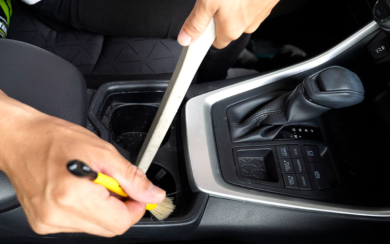 それで汚れている部分でいったら、隙間に少しホコリが入っているので掃いちゃいます。ステアリングの付け根の部分とかも掃いていきます。