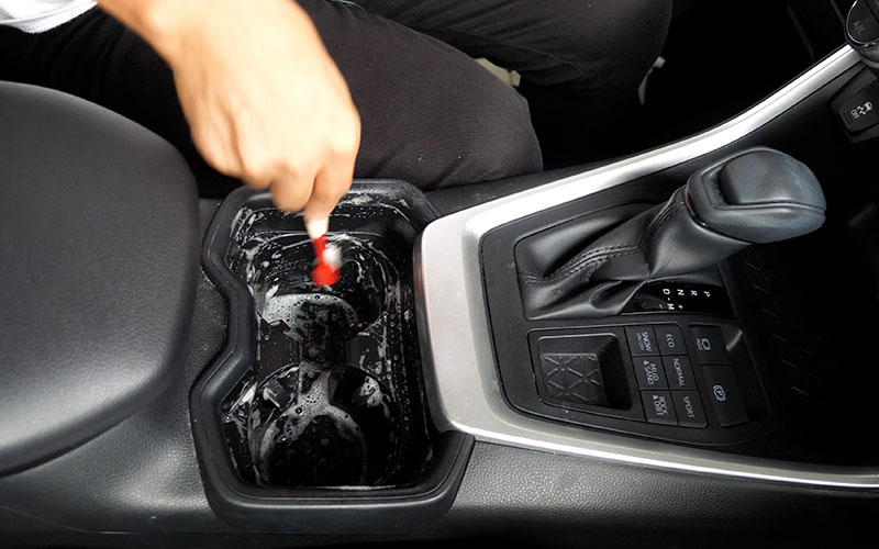 そうしたら、刷毛で申し訳ないけど、ドリンクホルダーをチリトリ代わりに使わせてもらって、下に汚れを落としていきます。