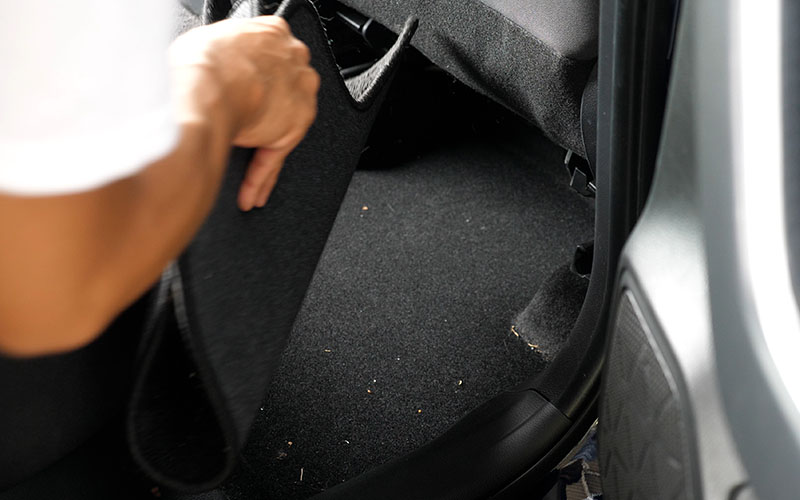 そうしたら、フロアマットを取りましょう。フロント側もリア側もすべて取っていきます。
