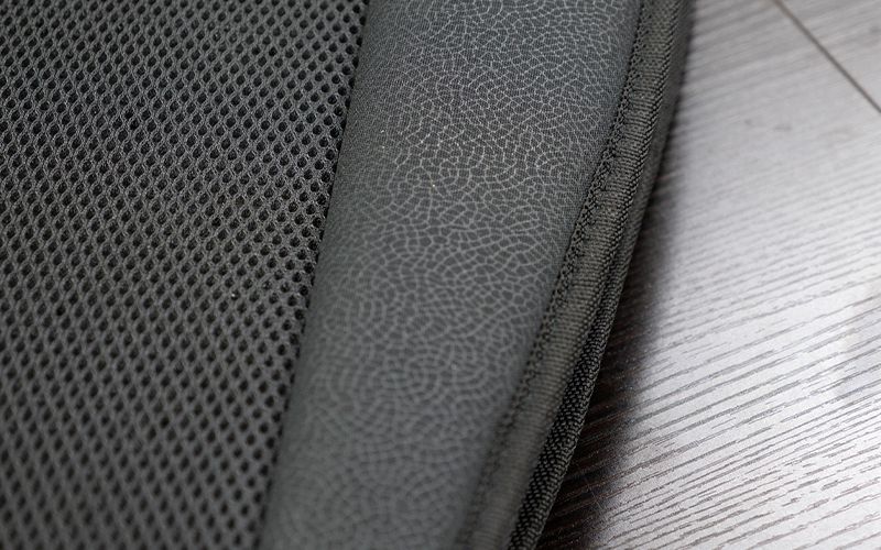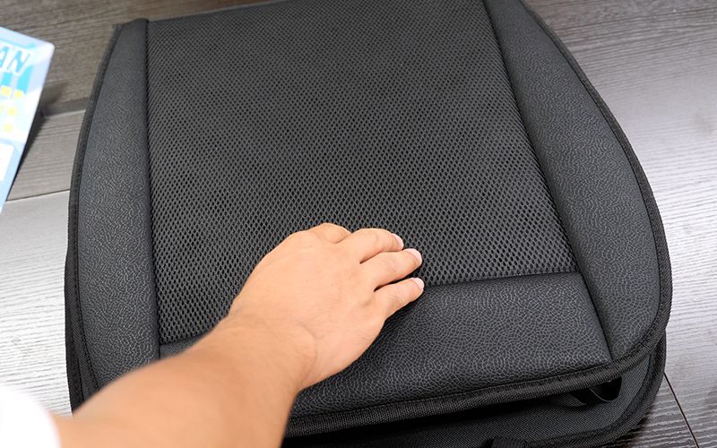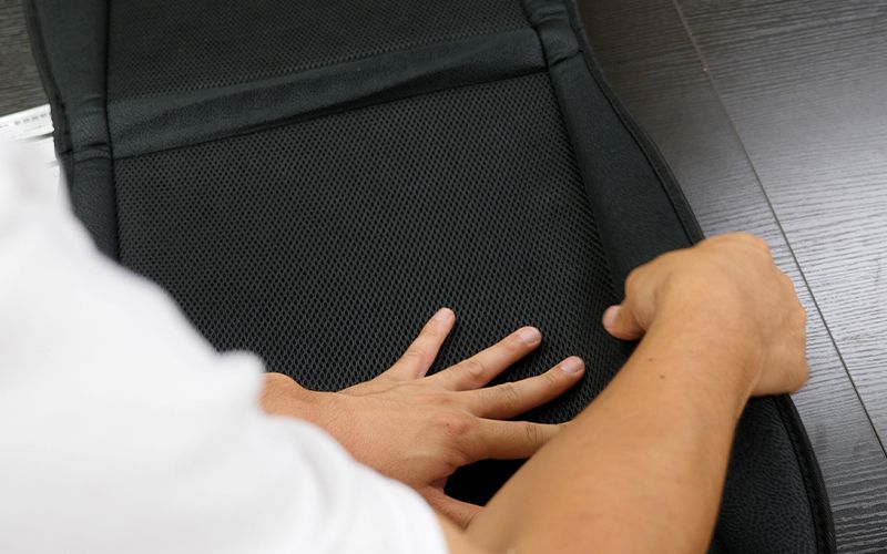 穴がポツポツ開いている座面のところと背もたれの部分から空気が出てくるんだと思います。硬さを例えるとしたら、硬めの下敷きのような感じ。