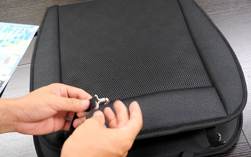 ここの生地はメッシュですね。椅子に固定するためのフックが付いていてカチッと止めるような感じです。