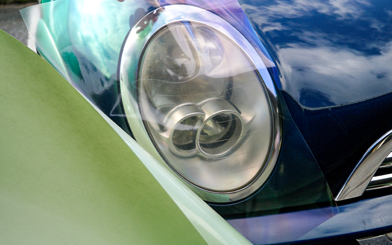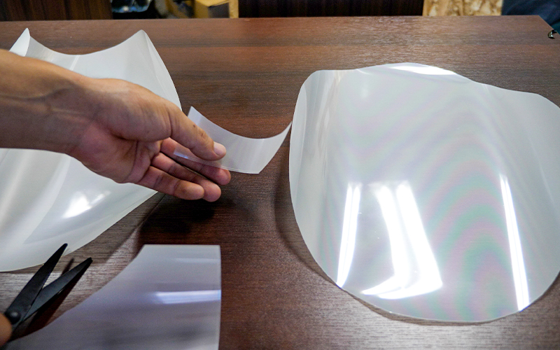 まずは、型取り用の透明のシートを用意してヘッドライトに貼り付けます。