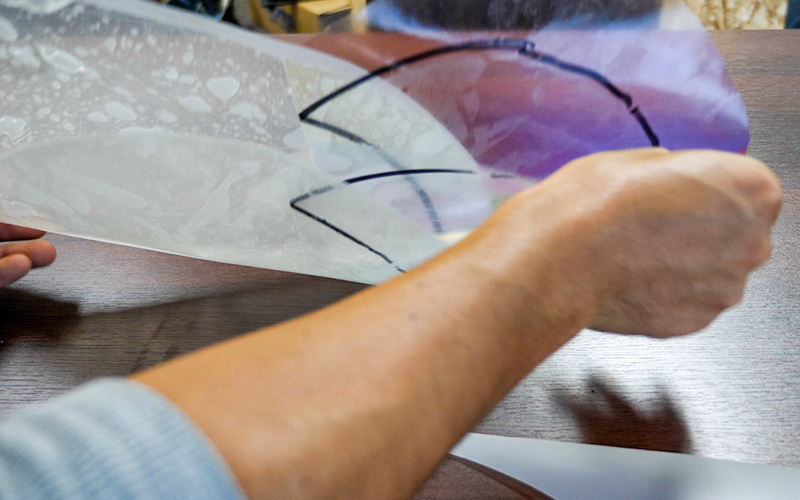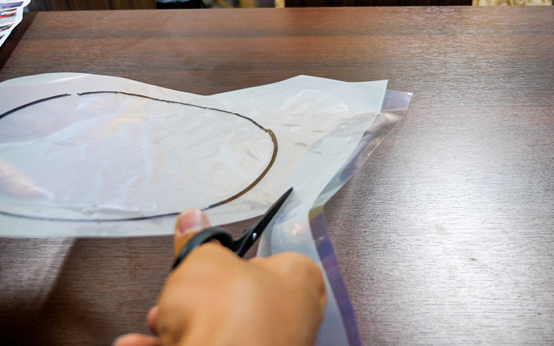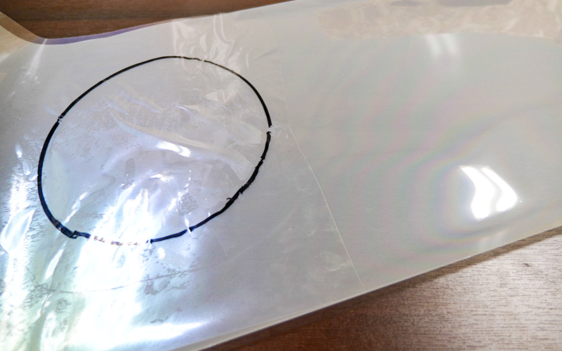 次に、リバイバルシートを用意して、さっき型取りをした透明のシートを上から貼り付けて(リバイバルシートのツルツルした面に貼り付けます)、型取りした線から約30mmぐらい大きめにリバイバルシートと一緒にハサミで切り取っていきます。