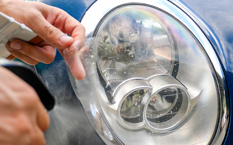 手順はさっきと同じになりますが、大きさが違うのでしっかり貼る場所や位置を決めた上で水を中性洗剤で薄めた水でヘッドライトもリバイバルリートを吹き付けていきます。
