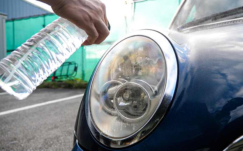 貼り付ける前に、水と中性洗剤を0.1%ぐらい入れた液体をヘッドライトとリバイバルシートに十分吹き付けていきます。