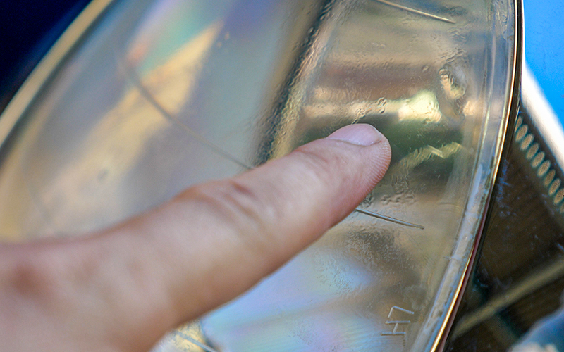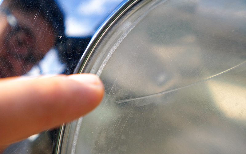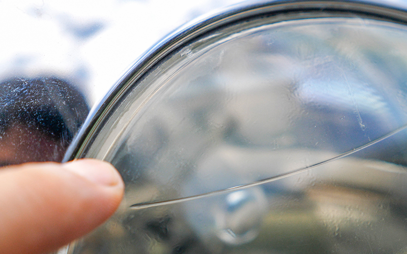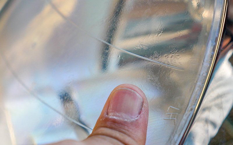 しかし、近づいてよくよく見てみると全体的に黄ばんでいて、クラックと呼ばれる劣化してヒビ割れがおきている部分が指差している部分にあるのがわかると思います。