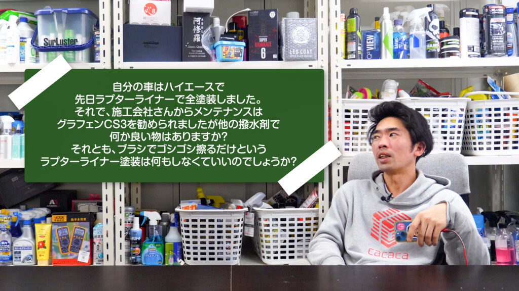 いつも大変ためになる動画をありがとうございます。自分の車はハイエースでつい先日ラプターライナーで全塗装しました。それで、施工会社さんからメンテナンスはグラフェンCS3を勧められましたが、他の撥水剤で何か良い物はありますか?それとも、やはりブラシでゴシゴシ擦るだけというラプターライナー塗装は何もしなくていいのでしょうか?
