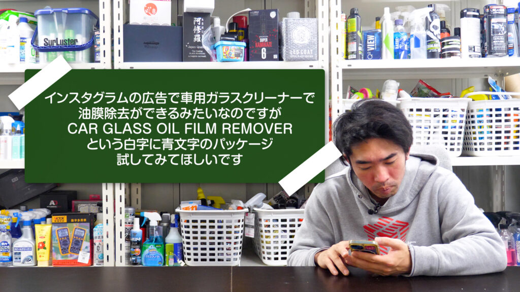 インスタグラムの広告で出てきた車用ガラスクリーナーで油膜除去ができるみたいなのですが、CAR GLASS OIL FILM REMOVERという下地に青文字のパッケージ、試してみてほしいです