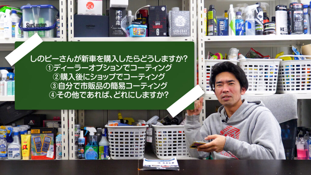 しのピーさんが新車を購入したらどうしますか?①ディーラーオプションでコーティング②購入後にショップでコーティング③自分で市販品の簡易コーティング④その他であれば、どれにしますか?