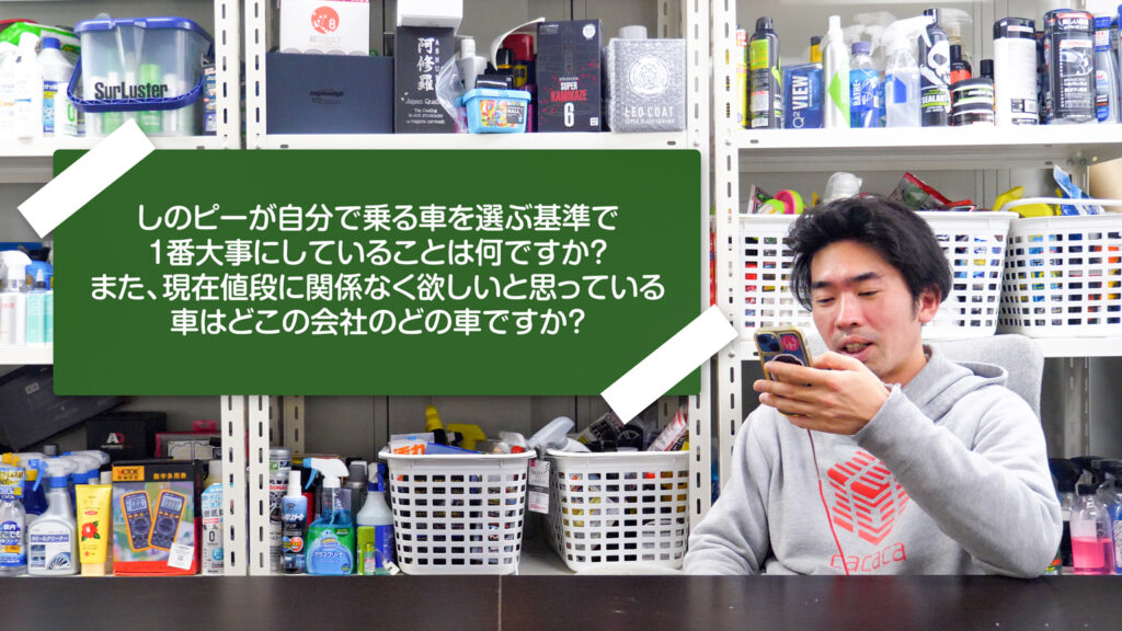 いろんな車に接していると思いますが、しのピーが自分で乗る車を選ぶ基準で1番大事にしていることは何ですか?また、今現在で値段に関係なくこの車が欲しいと思っている車はどこの会社のどの車ですか?