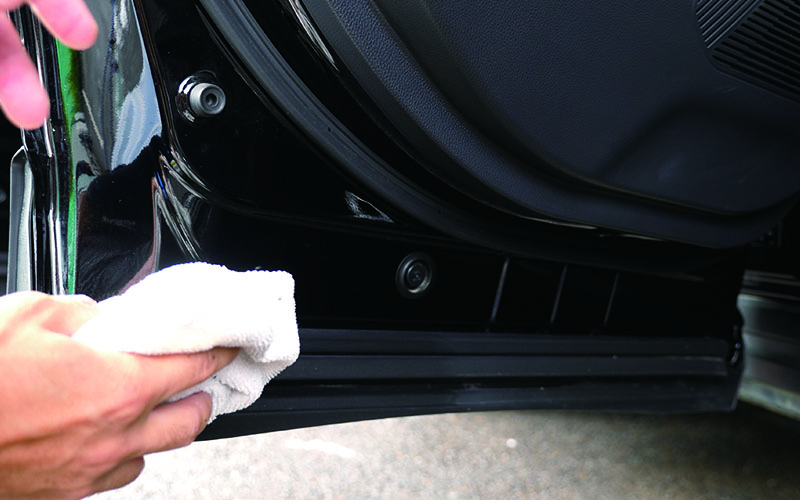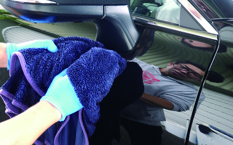 ある程度全体の水滴を拭き取ったら、細かい部分の拭き上げを行います。