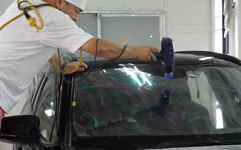フロントガラスは湾曲している為、貼った後に剥がれてこないように熱成形をしています。