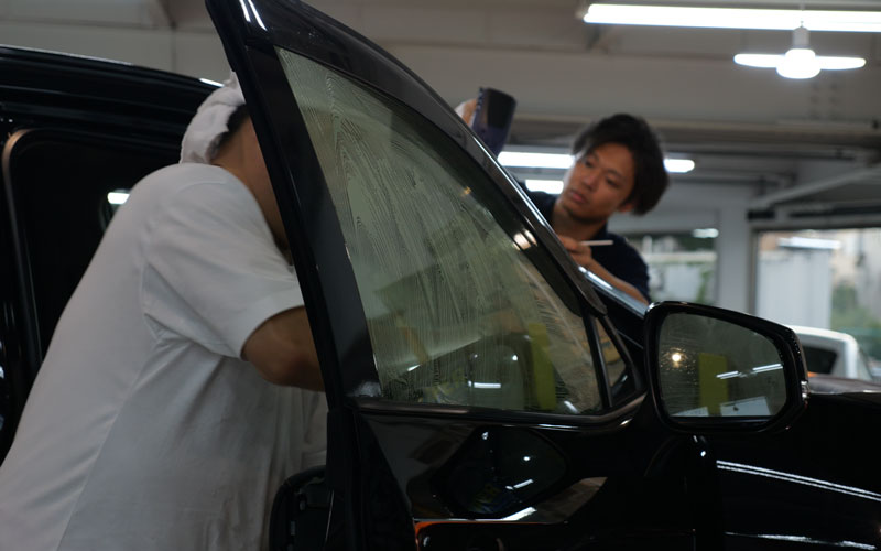 フロントガラスだけでなく運転席、助手席、更に三角窓にもFGR-900UVを施工していきます。