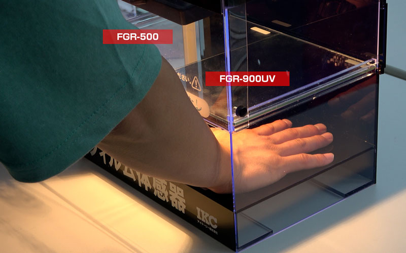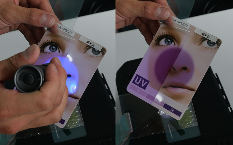 左側に『FVR-900UV』、右側に『従来品フィルム』を紫外線チェッカーに紫外線ライトを当てます。