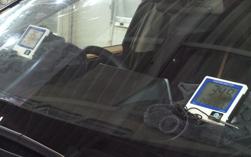 フロントガラスの左側(運転席側)に今回施工する『FGR-900UV』を置いて、赤外線ヒーターで車内温度がどれだけ上がるのか違いを見て行きます。