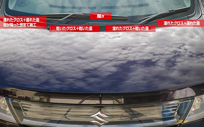 濡れたボディ+乾いたクロスで施工した面は水の動きがよりゆっくりな気がするので、やはり水を含んだ分だけ成分が薄まるのかな。