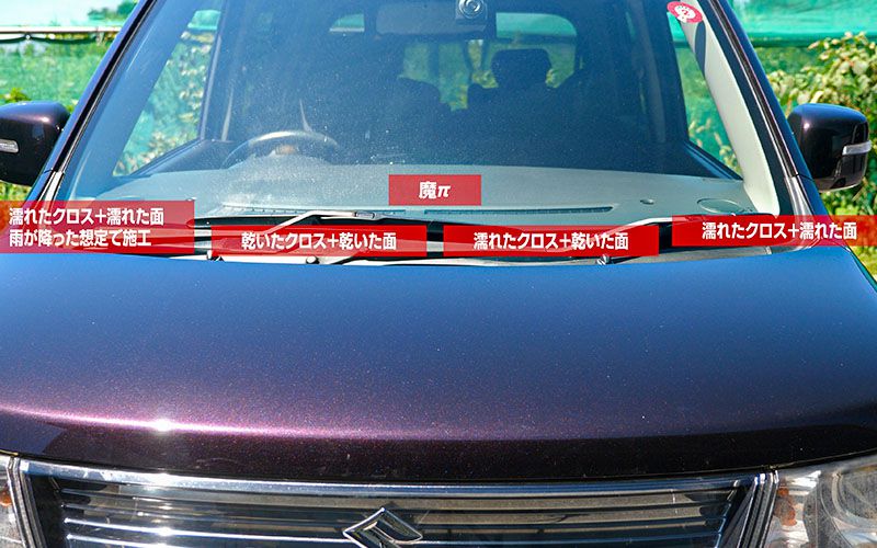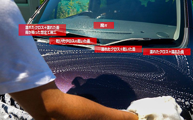 『魔π』の使用方法に「ある程度水気を拭き」と記載されているので、1番それに近いであろう濡れたボディ+乾いたクロスで施工します。