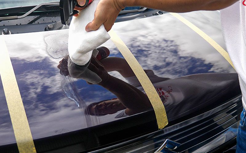 この面はボディが乾いた状態にスプレーし、濡らして固く絞ったクロスで施工します。