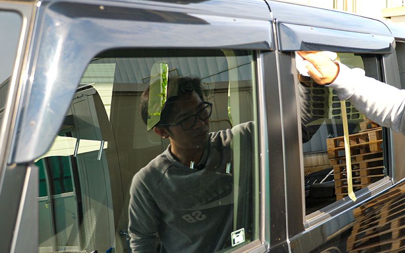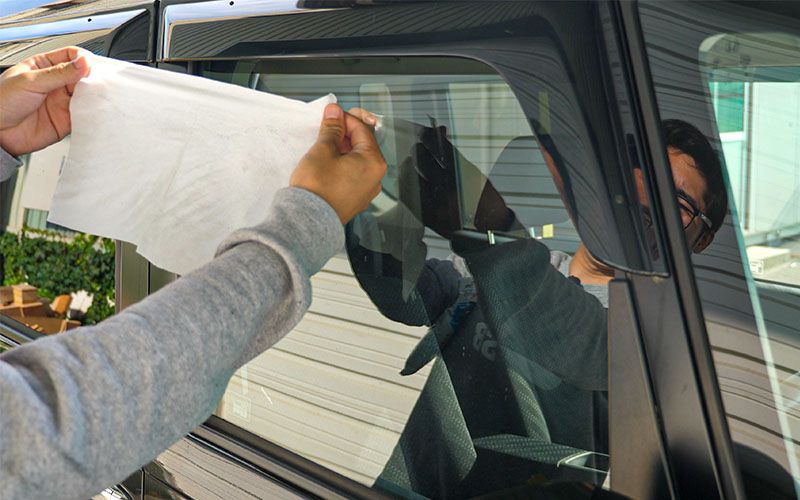 まずは窓ガラスから施工していきます。1枚のサイズは大体これくらいで、半分にするとハガキより一回り大きい位です。