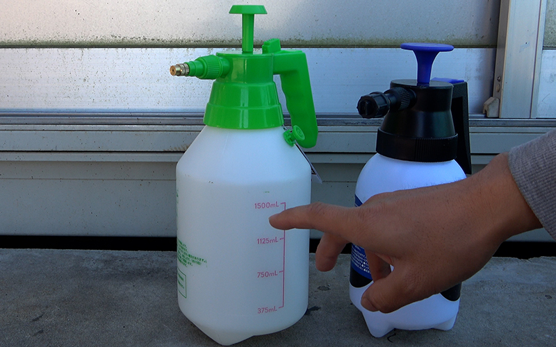 液剤が入る量について、『100均の噴霧器』は1500mlまでメモリがあって、ソフト99の『モビルフォーマー』には1Lまでのメモリがあるので『モビルフォーマー』の方がひと回り小さいことになります。