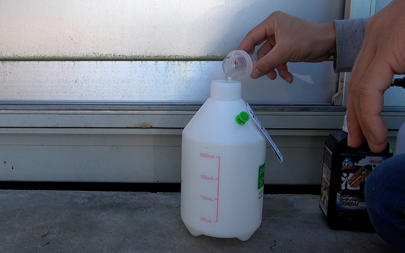 まずは、「3の法則」に乗っ取ってウイルソン『泡仕立てシャンプー』を9ml入れて水を1L入れて軽く振って混ぜたら上部に付いているポンプレバーを50回ほど押していきます。